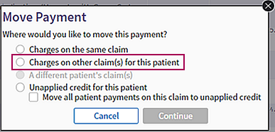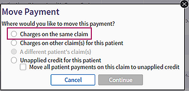- In the Move Payment window, select the Charges on the same claim option.