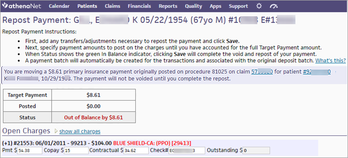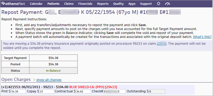 The claim is updated, and all transactions occur within the specified payment batch. athenaOne automatically creates and closes the batch after a successful reposting. - If some patient transactions cannot be voided, you see a message to that effect.