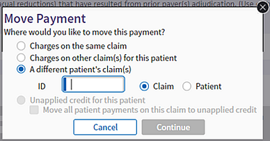 You can move a payment from one patient claim to a claim for a different patient. You can select this option from the Move Payment window only when you are moving an insurance payment.
