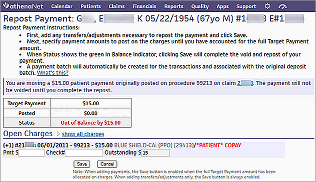 Important: athenaOne voids and reposts payments on a claim only when you repost all the payments and click Save. You can cancel the transaction at any time before clicking Save. When you click Cancel, athenaOne does not create the payment batch or post the transactions.
