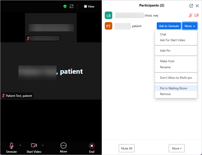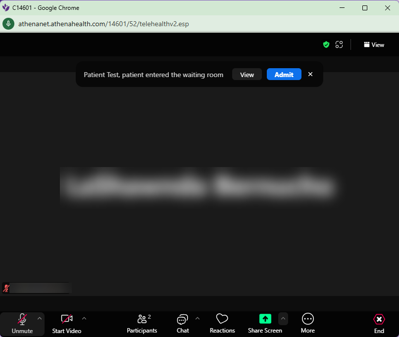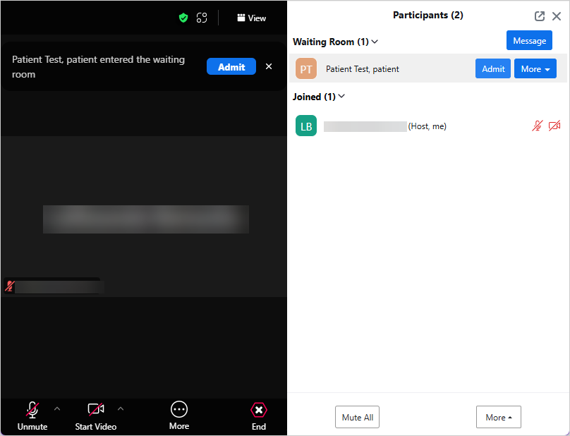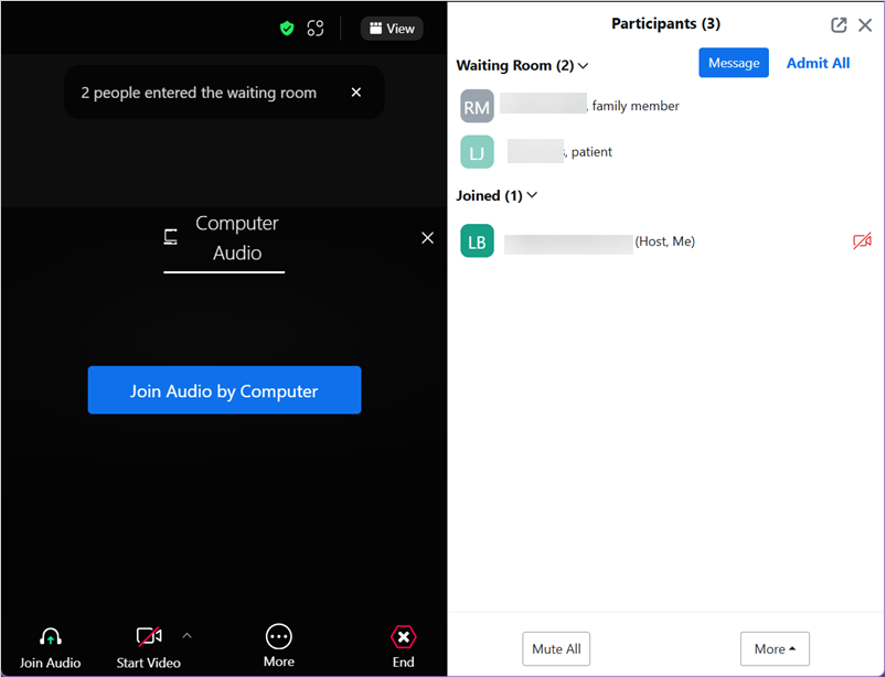 If the patient is showing as online, and you (an medical assistant, nurse, or doctor) join the call, pause and wait to be prompted to admit the patient. You may also go to the participant panel and wait for the patient to appear and admit them from there.