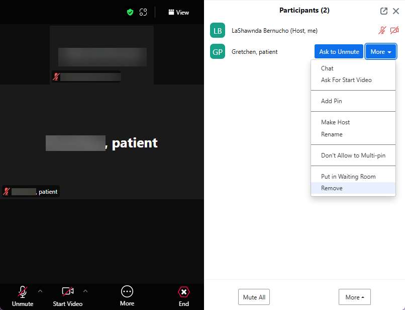 Tap Remove. If a patient is removed from the call, they will be able to rejoin the call.
