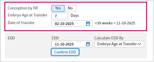 Select options to indicate whether your patient has an IVF pregnancy. The option you select may impact the patient's EDD calculation.