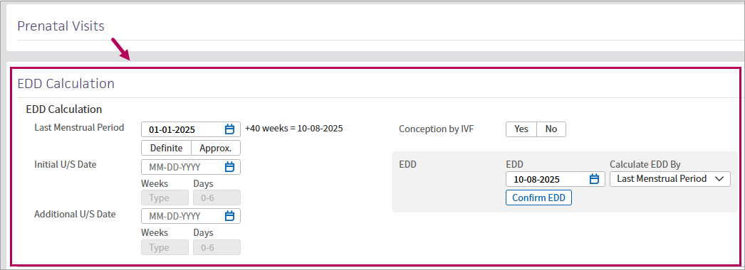 By default, the system uses the date of the patient's last menstrual period to auto-populate the date in the EDD field if this information is documented.