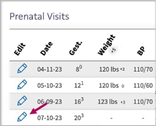 athenaOne automatically adds a row to the Prenatal Visits table each time you start an encounter for the patient. To update visit information, Access the OB Worksheet. In Prenatal VisitsClick Edit
